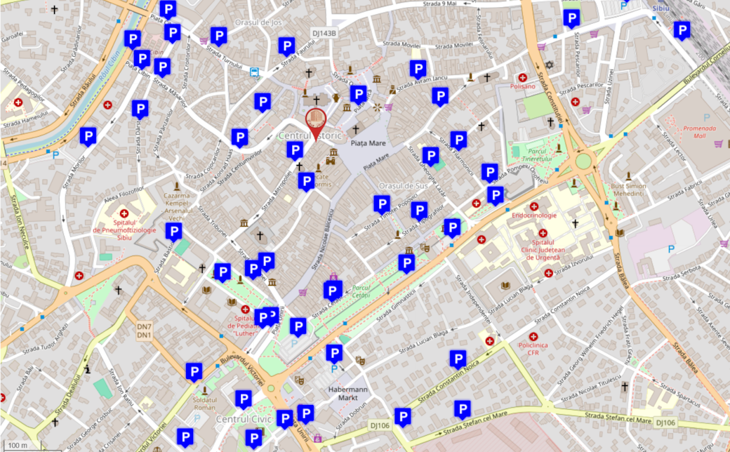 On the map below, you can see the main parking areas in central Sibiu. For the official parking map of Sibiu (rates, zones, hours), please visit the SPADPP website: View the SPADPP parking map